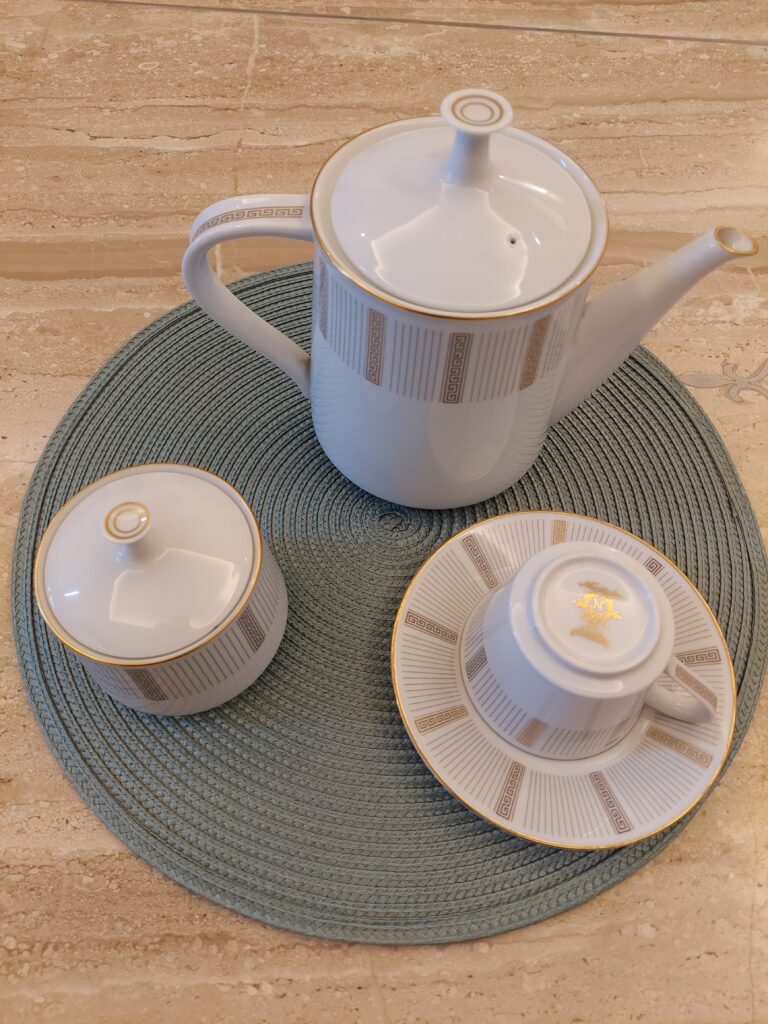Belongs to our family a vintage collection more than 55 years old.This beautiful porcelain collection was brought by my father in law who is no more with us , from Japan way back . Silently the pot holds countless cups of stories of our family conversations.NORITAKE HUMORESQE 6685, was produced from 1965- 1979 & now it is a collectors item.The GREEK KEY BANDS with linear accents & gold rimmed makes it more aesthetic& a timeless appeal.